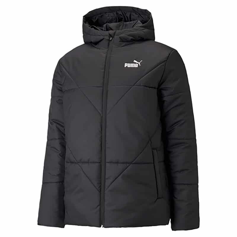 Svart vadderad jacka för män, designad för att ge värme och komfort under kalla förhållanden. Den är tillverkad med pumas warmcell-teknologi, som fungerar som en personliga sköld mot kyla genom att hålla värmen nära kroppen.
