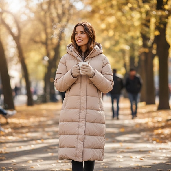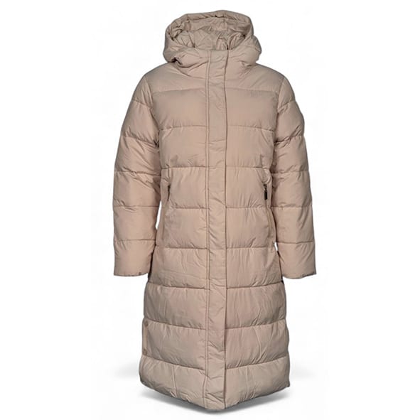Lång täckkappa som går ner över knäna. Kappan har huva, framfickor med dragkedja och tryckknappar i sidorna nertill